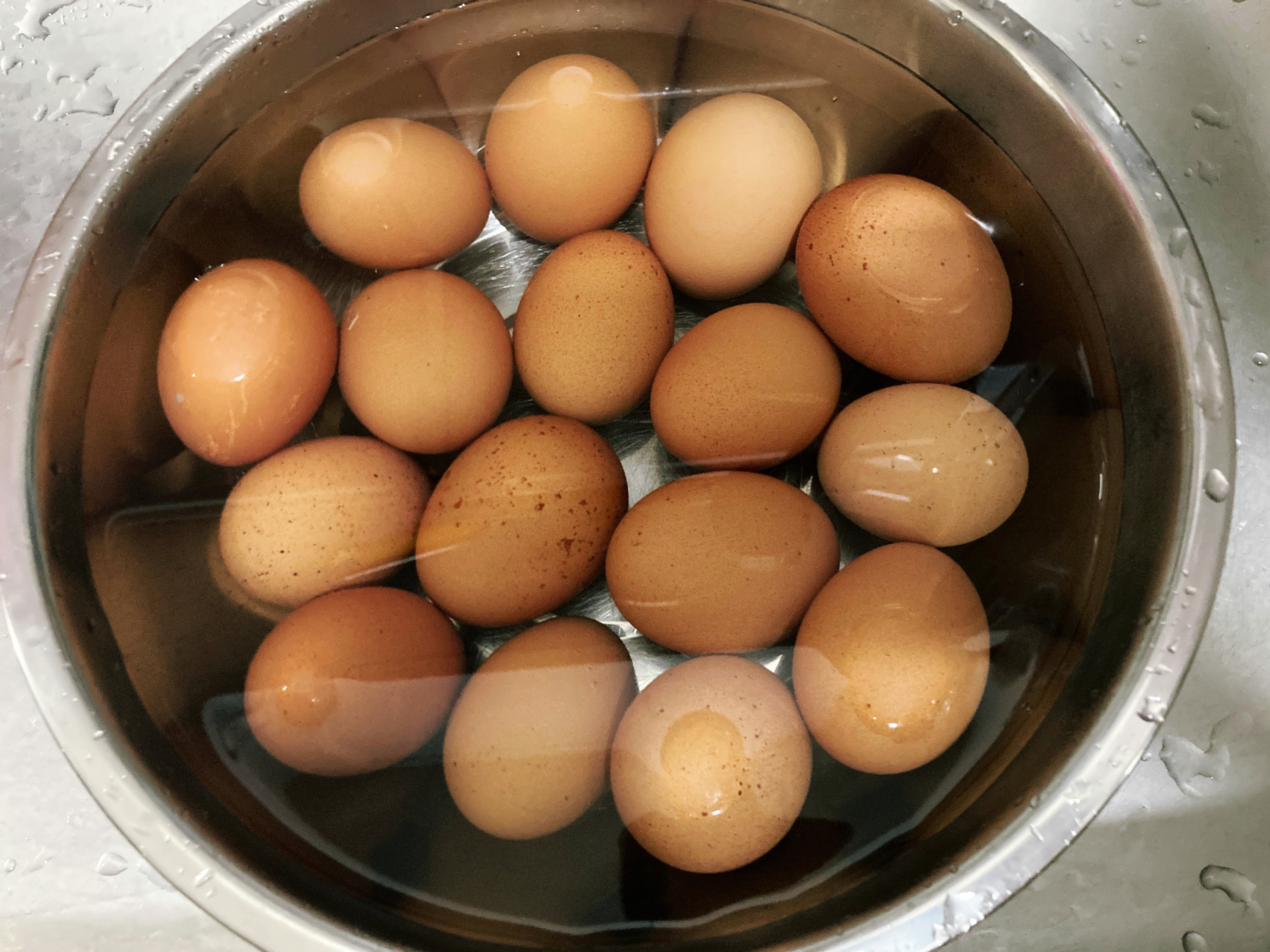 - 계란 준비: 계란을 냄비에 넣고 물이 잠길 정도로 채운 뒤, 소금 1작은술(분량 외)을 넣고 중불에서 10~12분간 삶아 단단한 삶은 계란을 만듭니다. 삶은 계란은 찬물에 담가 껍질을 벗기기 쉽게 만든 뒤 껍질을 벗겨 준비해요.