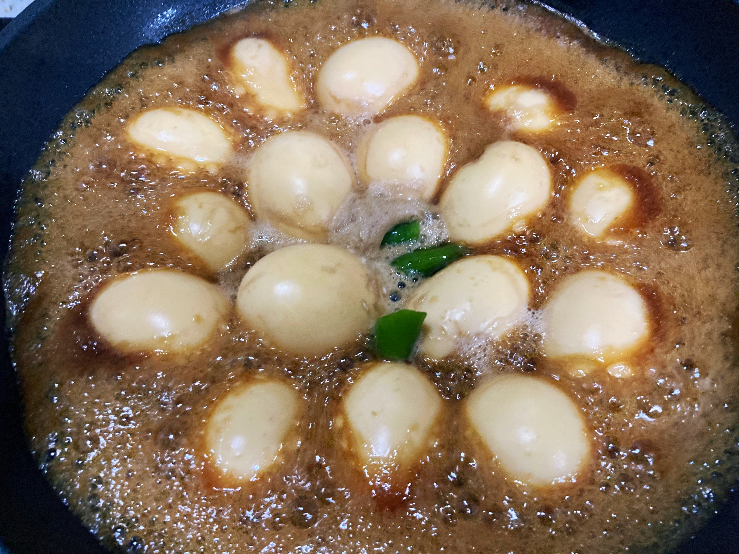 4. 조림 시작: 양념장이 담긴 냄비를 중불에 올리고 끓기 시작하면 삶은 계란과 꽈리고추를 넣습니다. 뚜껑을 덮고 약불로 줄여 15~20분간 조려요. 중간중간 주걱으로 계란과 꽈리고추를 살살 뒤적여 양념이 골고루 배도록 합니다.