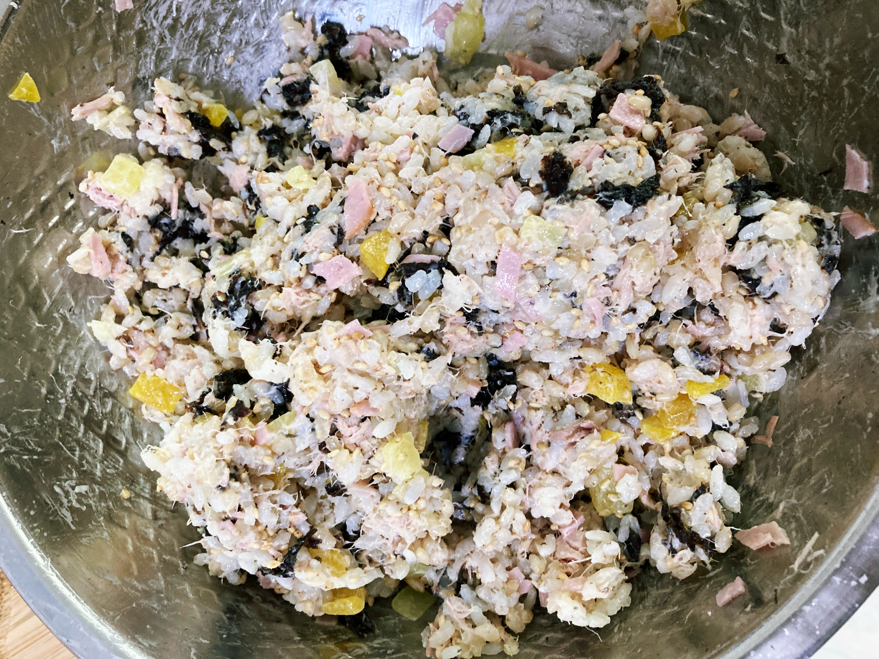 참치마요 주먹밥 재료 : 참치캔, 마요네즈, 단무지, 슬라이스 햄, 김, 깨소금, 참기름, 소금